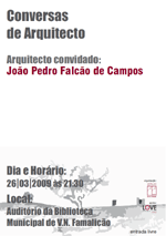 O Núcleo de Arquitectos da Região de Braga, NARB, apresenta a 26 de Março, 21h30, no Auditório da Biblioteca Municipal de Vila Nova de Famalicão, uma sessão do ciclo "Conversas de Arquitecto", com o Arquitecto João Pedro Falcão de Campos. Mais informações através do e-mail narb@oasrn.org Para efeitos de Admissão na Ordem dos Arquitectos, a conferência equivale a 1 crédito de “Formação Obrigatória em Matérias Opcionais de Arquitectura”. |
