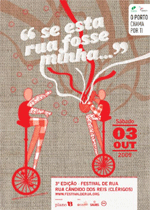O 'plano B', associação cultural, no âmbito do 'Festival de rua', convida pelo terceiro ano consecutivo a comunidade artística e o público em geral a apropriarem-se da Rua Cândido dos Reis, Porto, no dia 3 de Outubro. O Festival apresenta em 2009 instalações, Workshops Infantis, Música, Performances, Teatro, Malabarismo, e outras actividades como Passeio de burros, Noivas dos Clérigos e Jogos pouco tradicionais. A entrada é livre. Programa completo e outras informações em www.festivalderua.org |