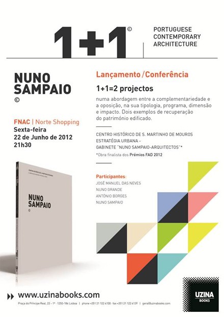 A UzinaBooks promove no dia 22 de Junho, às 21h30, na Fnac Norte Shopping, o lançamento do livro '1+1=2 projectos' do gabinete Nuno Sampaio Arquitectos, no âmbito da colecção 1+1 daquela editora. O livro apresenta dois exemplos de recuperação do património edificado: Centro Histórico de S. Martinho de Mouros e Estratégia Urbana.