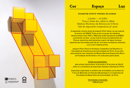 Organizada no âmbito do Mestrado em Estudos Museológicos e Curadoriais da Faculdade de Belas Artes da Universidade do Porto, FBAUP, "esta exposição reúne um conjunto de obras de Joaquim Pinto Vieira (n. 1946), na sua maioria pertencentes ao acervo da FBAUP. Trata-se de um grupo de trabalhos desenvolvidos entre 1967 e 1969 pelo então estudante da ESBAP: exercícios abstratizantes a partir da figura humana, experiências informadas pela Op Art e formatos inovadores utilizando a luz como matéria-prima".