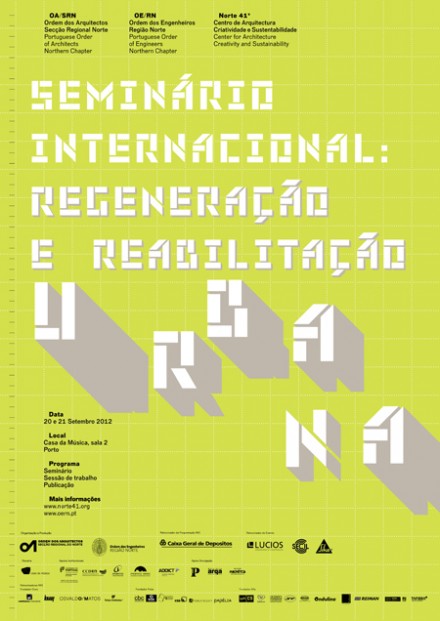 A Ordem dos Arquitectos - Secção Regional Norte, OASRN, no âmbito do projecto Norte 41º - Centro de Arquitectura, Criatividade e Sustentabilidade, e a Ordem dos Engenheiros - Região Norte, OERN. vão organizar o Seminário Internacional sobre Regeneração e Reabilitação Urbana nos dias 20 e 21 de Setembro, na Casa da Música - Sala 2. O Seminário tem como comissários convidados o arquitecto Eduardo Souto de Moura e o engenheiro José Novais Barbosa.
