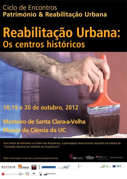 Nos dias 18, 19 e 20 de Outubro, vai decorrer a 1ª edição do 'Ciclo de Encontros: Património & Reabilitação Urbana', subordinada ao tema 'Reabilitação Urbana: Os centros históricos', a ter lugar no Mosteiro de Santa Clara-a-Velha e no Museu da Ciência da Universidade de Coimbra.
