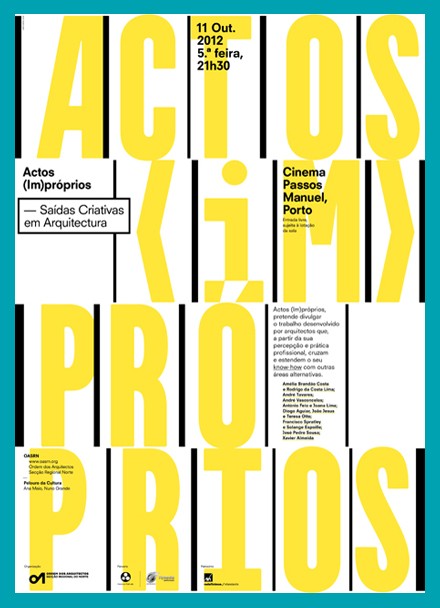 A OASRN organiza a sessão dedicada ao tema 'Actos (Im)próprios - saídas criativas em Arquitectura' a ter lugar no dia 11 de Outubro, 5ª feira, às 21h30, no Cinema Passos Manuel, Porto.