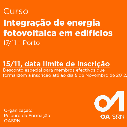 Nesse âmbito, a OASRN promove o Curso 'Integração de energia fotovoltaica em edifícios' a decorrer no Espaço de Formação da OASRN a 17 de Novembro, das 9h30 às 13h00 e das 14h00 às 18h30.