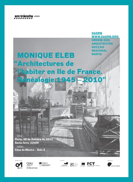 A próxima conferência em trânsito, promovida pela OASRN com o Grupo de Investigação Atlas da Casa - Housing architectural design and forms of dwelling do Centro de Estudos de Arquitectura e Urbanismo, CEAU/FCT, da Faculdade de Arquitectura da Universidade do Porto, FAUP, é dedicada ao tema 'Architectures de l'habiter en Ile de France. Généalogie.1945-2010' e tem como convidada Monique Eleb.