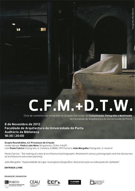 O CCRE - Centro de Comunicação e Representação Espacial da Faculdade de Arquitectura da Universidade do Porto, FAUP, em parceria com o grupo de investigação Espaço F-FAUP e CITYSCOPIO Associação Cultural, realizam, a 8 de Novembro de 2012, na FAUP, das 18h30 às 20h00, a 2ª sessão 'Scopio Roundtables #2: Processos de criação' do Ciclo de Conferências C.F.M. + D.T.W., moderada por Pedro Neto, que conta com a participação de: