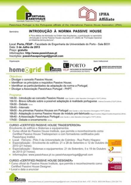 14h30 | Introdução ao conceito Passive House | João Gavião e João Marcelino (Homegrid e PHPT) 15h10 | Breve reflexão sobre a possível adaptação à realidade portuguesa | Helena Corvacho (FEUP) 15h30 | Debate 15h45 | Intervalo 16h00 | As primeiras Passive Houses em Portugal | João Gavião e João Marcelino (Homegrid e PHPT) 20min. 16h20 | Adaptação à norma Passive House de módulo pré-fabricado | Miguel Guedes (Miguel Guedes Arquitetos) 16h40 | A Associação Passivhaus Portugal | João Gavião e João Marcelino (Homegrid e PHPT) 17h00 | Debate e encerramento