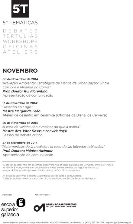 A Escola Superior Gallaecia (ESG) está a promover em Novembro o programa das Quintas Temáticas em torno de temas relacionados com Arquitectura e Urbanismo, Design Gráfico e Industrial, e Artes e Multimédia. A participação é livre e as sessões terão lugar todas as Quintas-feiras, a partir das 15h00, no auditório da ESG.
