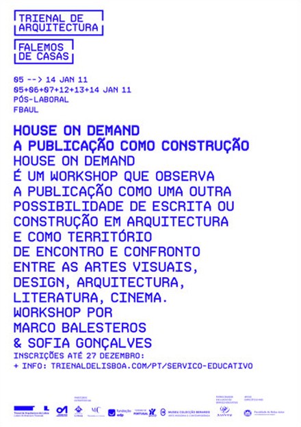 As inscrições para a 2ª edição do workshop 'House on demand', organizado no âmbito da Trienal de Arquitectura de Lisboa, TAL, a decorrer na Faculdade de Belas-Artes de Lisboa, de 5 a 14 de Janeiro 2011, estão já a decorrer.