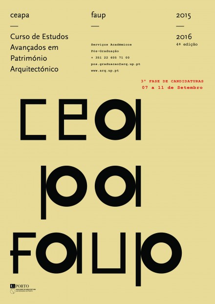 7 a 11 de Setembro de 2015 (11 vagas) | FAUP - A 3ª e última fase de candidaturas à 4ª edição do Curso de Estudos Avançados em Património Arquitectónico (CEAPA) vai decorrer de 7 a 11 de Setembro de 2015. O CEAPA, promovido pela Faculdade de Arquitectura da Universidade do Porto (FAUP) e coordenado pelo Professor Doutor Rui Fernandes Póvoas, "visa proporcionar formação especializada de nível pós-graduado (terceiro ciclo) na área do restauro, recuperação e reabilitação do património construído". Com a duração de um ano lectivo em regime de tempo parcial diurno, é objectivo deste Curso assegurar "a aquisição de competências e aptidões relevantes para as actividades de projecto e de investigação na área da salvaguarda do património arquitectónico."