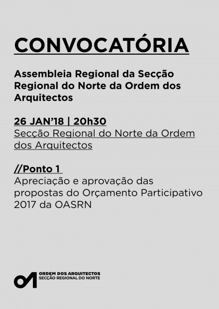 Nos termos da Lei e do Estatuto da Ordem dos Arquitectos, aprovado pelo Decreto-Lei n.º 176/98, de 3 de Julho com a redacção dada pela Lei nº.113/2015 de 28 de Agosto, convoco a Assembleia Regional da Secção Regional do Norte da Ordem dos Arquitectos para reunir em Assembleia Extraordinária nas instalações da Secção Regional do Norte da Ordem dos Arquitectos, sita na Rua Álvares Cabral, nº 144, no Porto, pelas 20h30 do dia 26 de Janeiro de 2018, com a seguinte Ordem de Trabalhos: