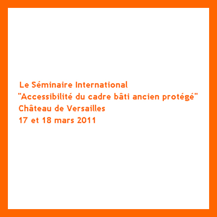 A associação francesa Tuttimobi, em parceria com o Ministère de la Culture, o Château de Versailles, l’Etablissement public de Versailles e a Fondation Design For All, está a organizar o Seminário Internacional "Acessibilidade em edifícios classificados" que decorre a 17 e 18 de Março, no Château de Versailles, em França.
