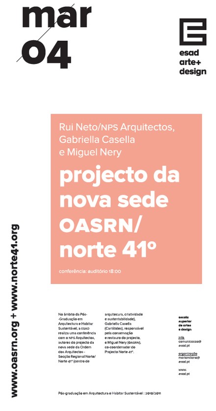 No âmbito da Pós-Graduação em Arquitectura e Habitar Sustentável, a Escola Superior de Artes e Design, ESAD, realiza a conferência "Projecto da Nova Sede OASRN/Norte 41º - Centro de Arquitectura, Criatividade e Sustentabilidade" com os NPS Arquitectos, autores do projecto da Nova Sede da OASRN no Porto, Gabriella Casella (Cariátides), responsável pela conservação e restauro do projecto e arquitecto Miguel Nery, membro do Conselho Directivo Regional Norte da Ordem dos Arquitectos e co-coordenador do Projecto Norte 41º.