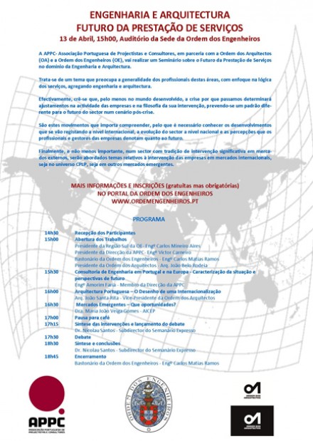 A Associação Portuguesa de Projectistas e Consultores, APPC, em parceria com a Ordem dos Arquitectos, OA, e a Ordem dos Engenheiros, OE, vai realizar um Seminário sobre o Futuro da Prestação de Serviços no domínio da Engenharia e Arquitectura.