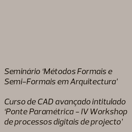 Associado a este Seminário, vai decorrer um curso de CAD avançado intitulado ‘Ponte Paramétrica - IV Workshop de processos digitais de projecto’ nos dias 27 a 30 de Junho, nas instalações da ESAP e da OPO’Lab.