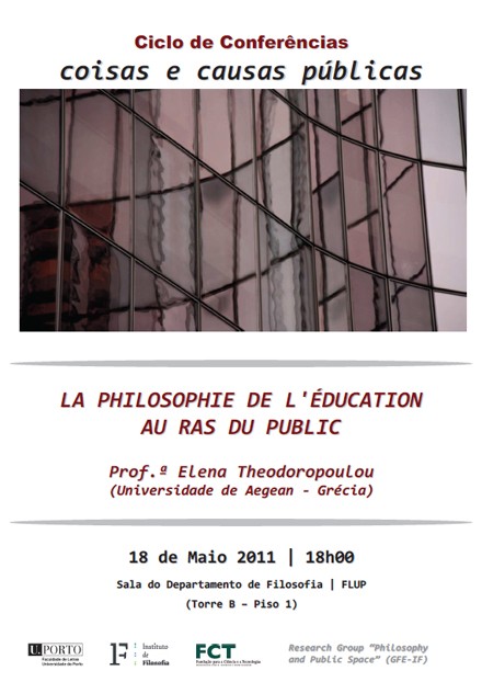 O Grupo de Investigação "Philosophy and Public Space" do Instituto de Filosofia da Faculdade de Letras da Universidade do Porto, FLUP, organiza a 7ª Sessão do Ciclo "coisas e causas públicas", com a conferência "La philosophie de l'éducation au ras du public", proferida pela Prof.ª Doutora Elena Theodoropoulou (Universidade de Aegean - Grécia).