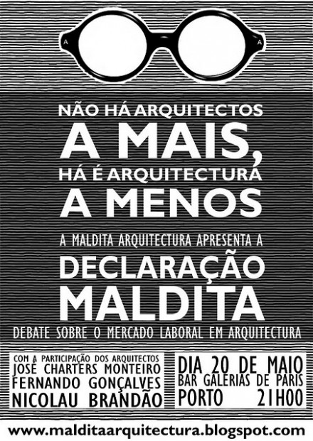 A plataforma Maldita Arquitectura apresenta no dia 20 de Maio, Sexta, às 21h00, no bar Galeria de Paris, na rua com o mesmo nome, no Porto, a 'Declaração Maldita', seguida de um debate.