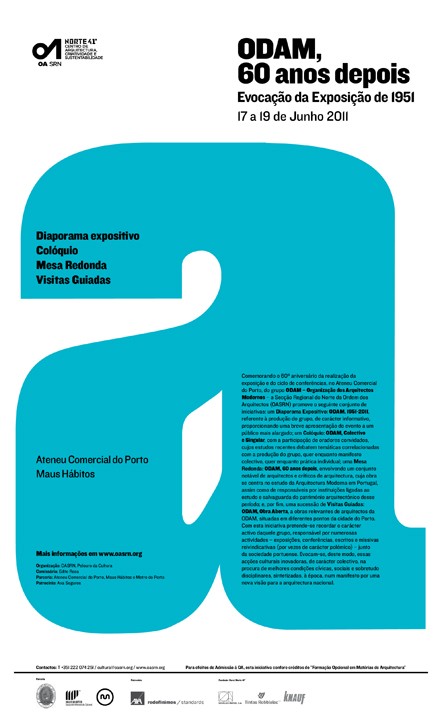 Está a decorrer até 9 de Junho o prazo de inscrições para a iniciativa 'ODAM, 60 anos depois | Evento evocativo da Exposição de 1951', organizada pela OASRN no âmbito da comemoração do 60º aniversário da realização da exposição e do ciclo de conferências, no Ateneu Comercial do Porto, do grupo ODAM – Organização dos Arquitectos Modernos.