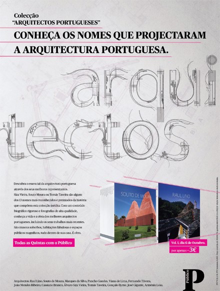 O jornal Público em parceria com a Editora QuidNovi vai lançar, no próximo dia 6 de Outubro, todas as 5ª feiras até 29 de Dezembro, uma colecção de 13 livros sobre Arquitectos Portugueses.