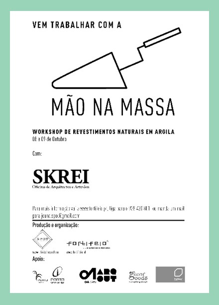 A S.P.O.T. e a Fortifeio, arquitectura e derivados, promovem nos dias 8 e 9 de Outubro o workshop "Mão na Massa" sobre técnicas e materiais que nos permitem recuperar o trabalho feito à mão – com as mãos –, orientado, nesta edição, pela oficina de artesãos SKREI, que abordará o tema dos Revestimentos Naturais em Argila.