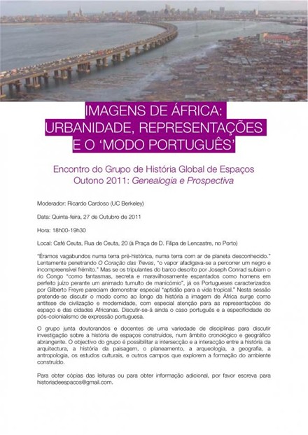 O próximo encontro do Grupo de História Global de Espaços decorre a 27 de Outubro, entre as 18h00 e as 19h30, no Café Ceuta, Porto, e é dedicado ao tema 'Imagens de África: Urbanidade, representações e o "modo português"'.