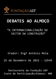 A Fundação AEP - Associação Empresarial de Portugal organiza um 'Debate ao Almoço' dedicado ao tema 'Internacionalização do sector da construção' tendo como orador o Eng.º António Mota.