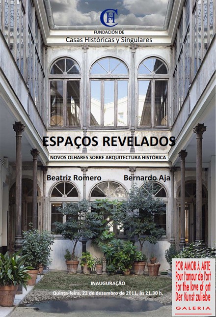 A Fundación de Casas Históricas y Singulares, entidade sem fins lucrativos que reúne pessoas interessadas na conservação do Património Cultural, apresenta a exposição 'Espaços Revelados: Novos olhares sobre Arquitectura Histórica' da autoria de Beatriz Romero e Bernardo Aja até 19 de Janeiro de 2012 na Galeria Por Amor à Arte, no Porto.