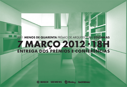 A cerimónia de entrega de prémio da edição 2011 do Prémio 'Cozinhas / Menos de Quarenta' (ver mensageiro #463), organizado pelo Jornal Arquitectos, J.A., com o patrocínio do grupo Balay / Bosch / Siemens / Gaggenau, decorre no dia 7 de Março, a partir das 18h00, no Auditório Nuno Teotónio Pereira, Ordem dos Arquitectos, em Lisboa.