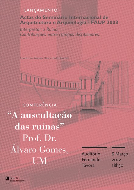 A sessão de lançamento das actas do Seminário Internacional de Arquitectura e Arqueologia - FAUP 2008 - 'Interpretar a Ruína, Contribuições entre campos disciplinares', edição coordenada por Lino Tavares e Pedro Alarcão, decorre a 8 de Março, 18h30, no Auditório Fernando Távora da Faculdade de Arquitectura da Universidade do Porto, FAUP.