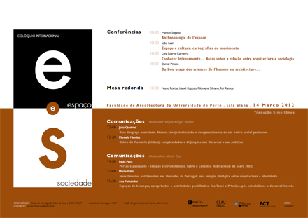 O Centro de Estudos de Arquitetura e Urbanismo, CEAU-FCT, com o grupo de investigação Atlas da Casa da Faculdade de Arquitectura da Universidade do Porto, FAUP, e o Instituto de Sociologia, Faculdade de Letras da Universidade do Porto, FLUP, promovem o Colóquio Internacional 'Espaço e Sociedade' no próximo dia 14 de Março na FAUP.