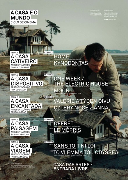 O Departamento de Arquitectura e Paisagem da Escola Universitária Vasco da Gama, PARQ-EUVG, e o cineclube Fila K, com coordenação dos arquitectos Patrícia Miguel e Gonçalo Barros, organiza o ciclo de cinema 'A Casa e o Mundo', até 29 de Março, às 5ª feiras, na Casa das Artes - Fundação Bissaya Barreto, em Coimbra.