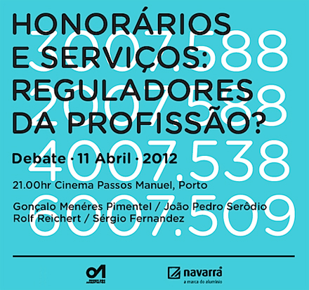 Depois da sessão realizada em Lisboa, o Conselho Directivo Nacional da Ordem dos Arquitectos, com o apoio da OASRN, organiza o debate 'Honorários e Serviços: reguladores da profissão?' no dia 11 de Abril, 4ª feira, às 21h00, no Cinema Passos Manuel, Porto.