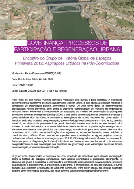 Acontece no dia 26 de Abril, das 18h30 às 20h00, na sala do Centro de Estudos de Geografia e Ordenamento do Território, CEGOT, na Faculdade de Letras da Universidade do Porto, FLUP (Piso 4 da Torre B), Porto, o encontro 'Governança, Processos de Participação e Regeneração Urbana', integrado no ciclo 'Primavera 2012: Aspirações Urbanas na Pós-Colonialidade' organizado pelo Grupo de História Global de Espaços. o Encontro é moderado por Pedro Chamusca (CEGOT-FLUP).