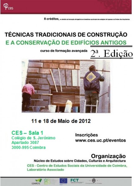 O Centro de Estudos Sociais - Laboratório associado da Universidade de Coimbra, CES-Coimbra, no âmbito do Núcleo de Estudos sobre Cidades, Culturas e Arquitectura, CCARq, organiza a 2ª edição do Curso de Formação Avançada 'Técnicas Tradicionais de Construção e a Conservação de Edifícios Antigos' a decorrer de 11 a 18 de Maio.