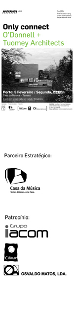Only Connect é o nome da conferência do ciclo em trânsito da dupla de arquitectos irlandeses ODonnell e Tuomey que terá lugar no próximo dia 5 de Fevereiro, Segunda-feira, às 22h00, na Casa da Música Terraço. Com entrada livre, a conferência será em inglês, sem tradução. É obrigatório o levantamento de ingressos na bilheteira da Casa da Música, disponíveis no próprio dia da conferência.