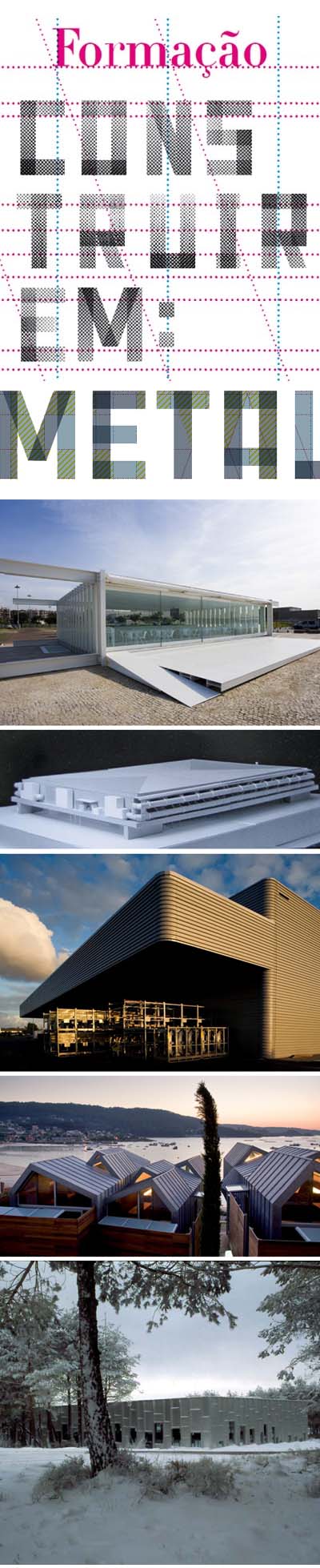Imagens (de cima para baixo) Bar Belém, João Pedro falcão de Campos © José Manuel Rodrigues Pavilhão Multiusos de Viana do Castelo, Eduardo Souto de Moura © Francisco do Vale InapalMetal, Guedes /de Campos (menos é mais)© Fernando Guerra | FG+SG Viviendas Unifamiliares, Pontevedra, Alfonso Penela Fernández © Manuel González Vicente Polidesportivo em Manzaneda, Alfonso Penela © DR